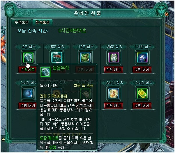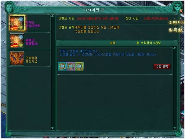 캐릭터 생성이벤트로 32레벨 달성시 주요령을 수령했습니다