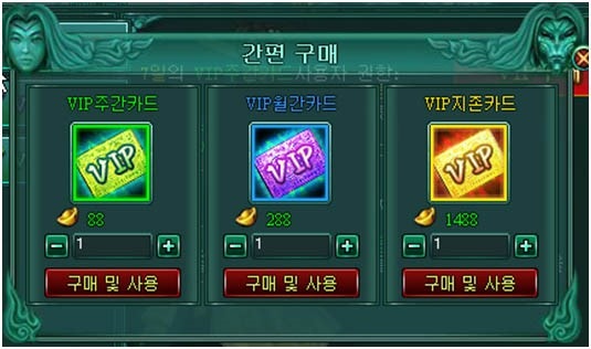 VIP 카드는 주간,월간,지존카드로 나뉘어지는데